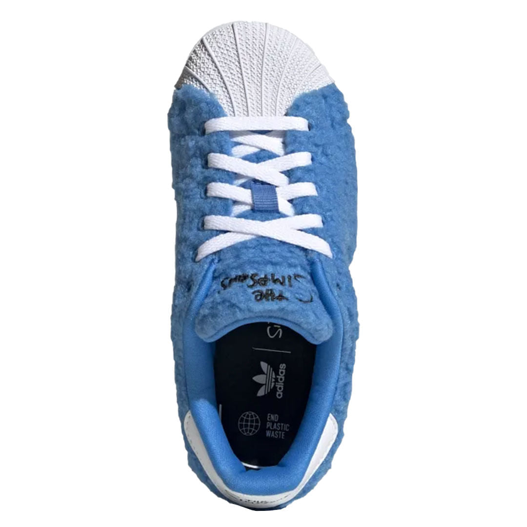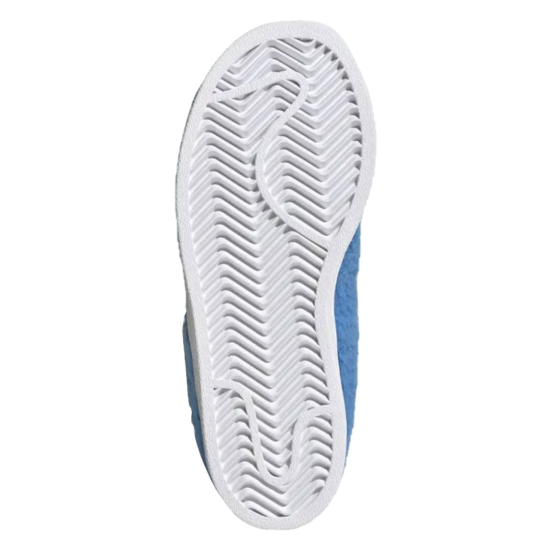 • O tom ousado de azul espalha-se por todo o cabedal têxtil, enfatizado ainda mais pelos detalhes emblemáticos do adidas Superstar, como a biqueira shell-toe de borracha e o talão em branco contrastante.
