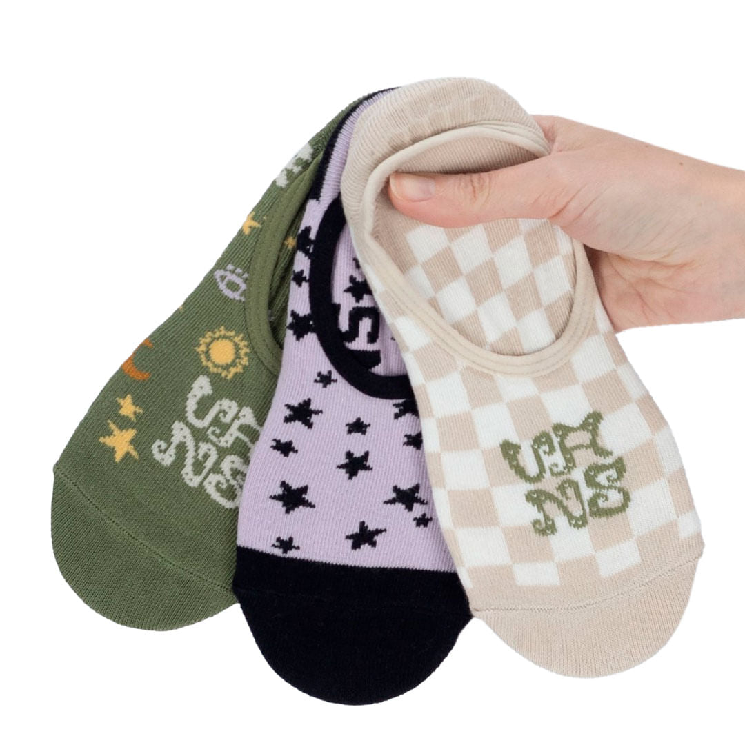 • Confeccionadas em um mix de fios que mescla algodão, poliamida e elastano, o kit de meias cano baixo tipo invisível Vans traz 3 pares de meias estampadas cada qual com um padrão: estrelas, checkerboard e ilustrações.A biqueira e o calcanhar reforçados aumentam o conforto e a resistência das meias.