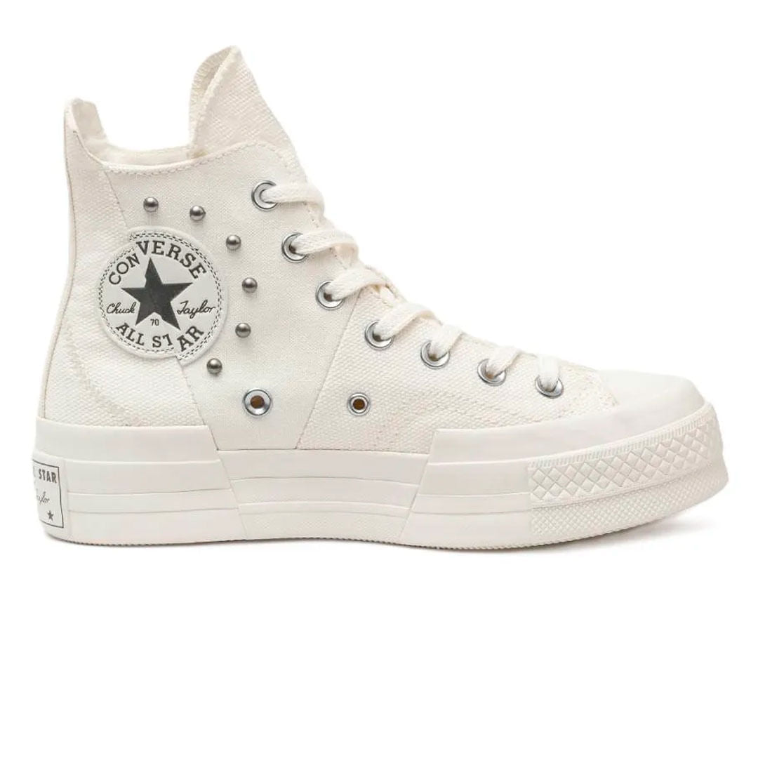 • O Chuck 70 Plus apresenta características clássicas do Chuck 70 e adiciona detalhes que conferem um visual único e disruptivo. • Confeccionado em tecido de algodão tipo lona e recebe rebites metálicos distribuídos pelo cabedal, elevando o estilo com um toque de glamour.