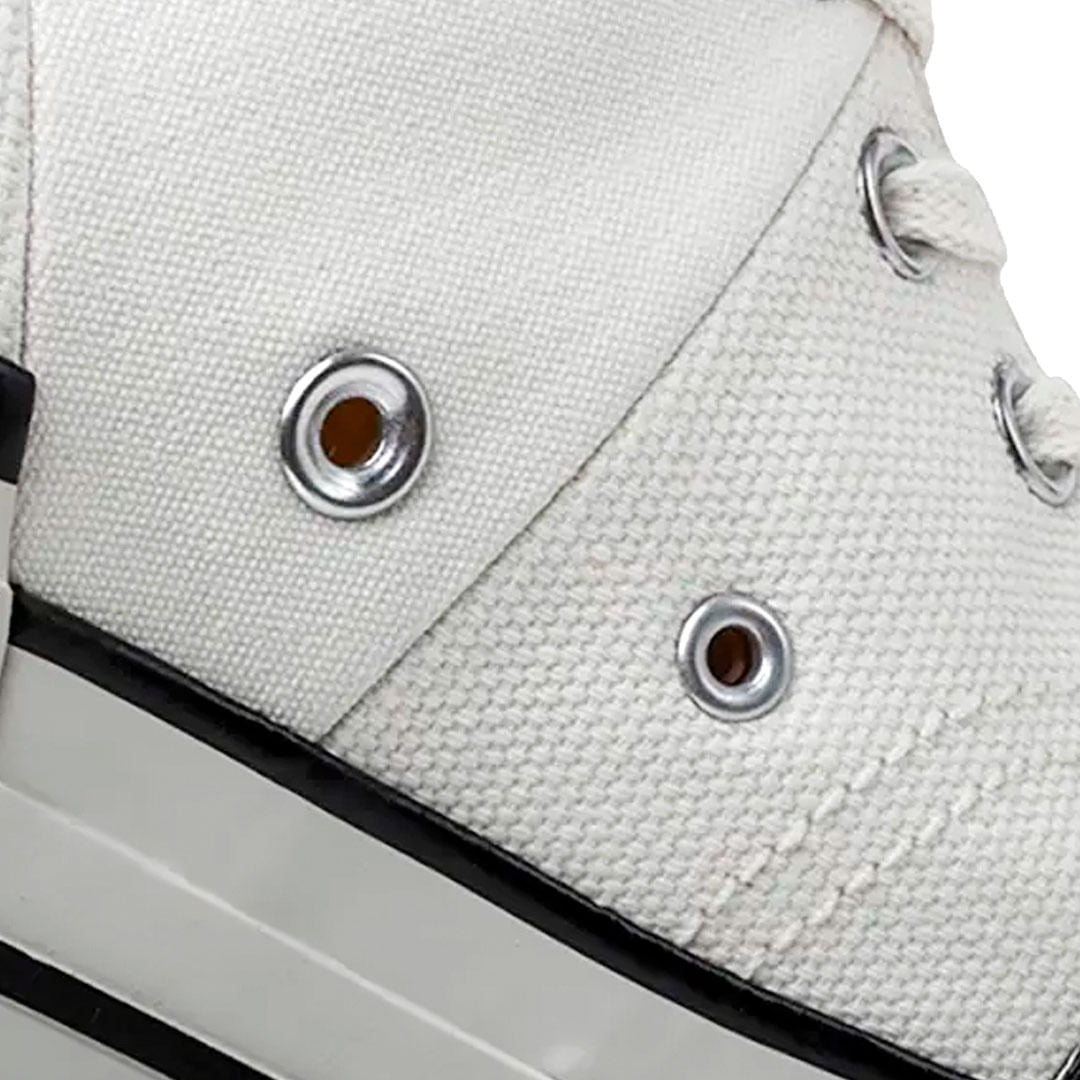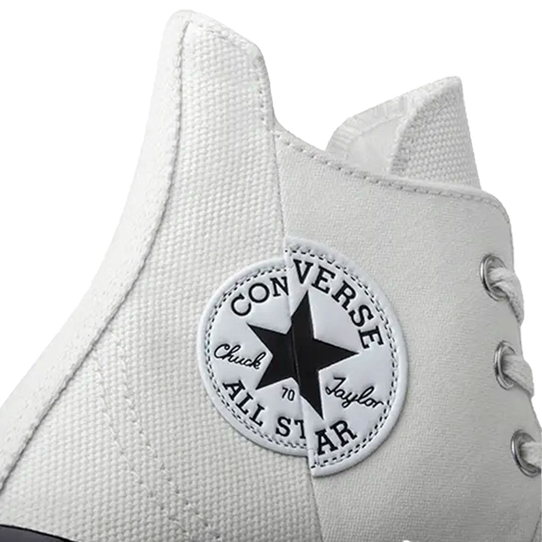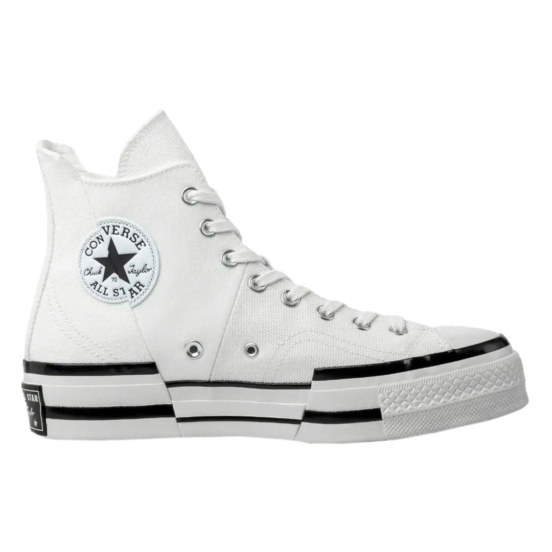 • Em busca do futuro, o Chuck 70 Plus apresenta características clássicas do Chuck 70 e adiciona detalhes que conferem um visual único e disruptivo. Confeccionado a partir de uma combinação de diferentes gramaturas de canvas de algodão separadas por cortes assimétricos, o tênis recebe costuras duplas e uma tira de tecido gorgurão no calcanhar para adicionar mais resistência e sustentação, além de trazer ilhoses laterais para uma transpiração adequada aos pés. A vira de borracha com sua aplicação de verniz, possui aspecto vintage e também recebe cortes assimétricos para complementar ao seu tradicional visual. O Patch Logo em homenagem ao Converse Chuck Taylor All Star aplicado na parte interna dos canos, também possui cortes que complementam seu visual, e a heeltab do calcanhar tem seu tamanho aumentado e traz o logo Converse Chuck Taylor aplicado. O solado de borracha vulcanizada, além de bicolor, é 0,5 cm mais alto do que o Chuck Taylor All Star. O conforto fica por conta do forro acolchoado e das palmilhas Ortholite, proporcionando amortecimento ideal.