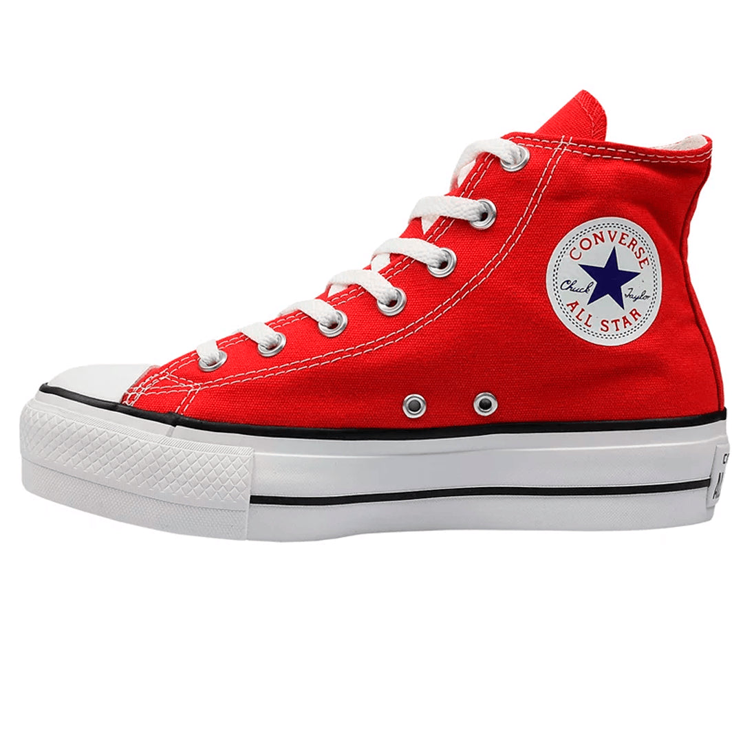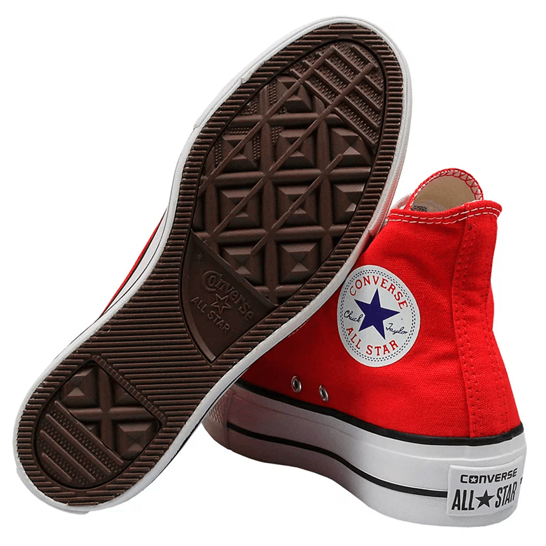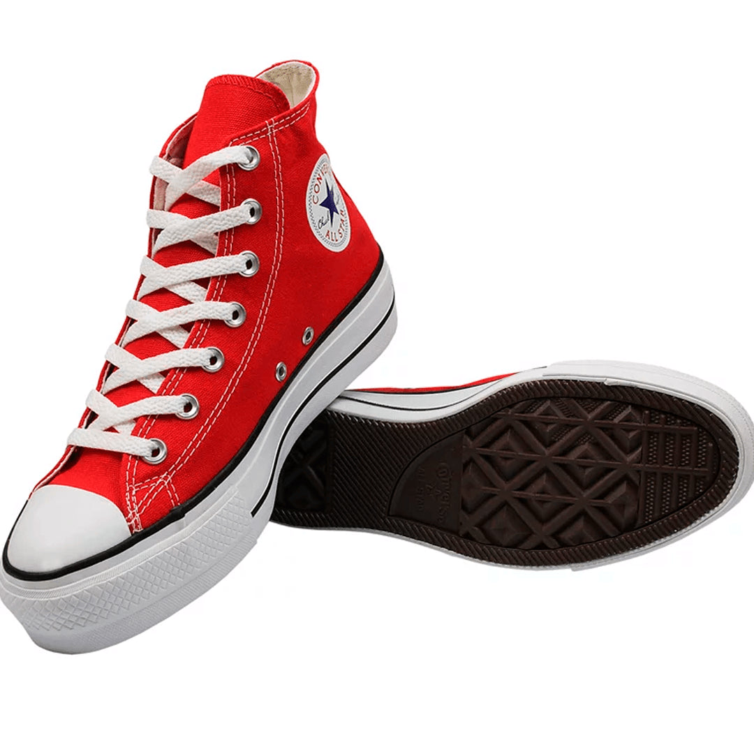 • Confeccionado em tecido de algodão tipo lona, trazendo o modelo clássico do Converse Chuck Taylor com um solado plataforma de aproximadamente 4 cm de altura. Possui 2 ilhoses laterais, que facilitam a transpiração adequada dos pés.