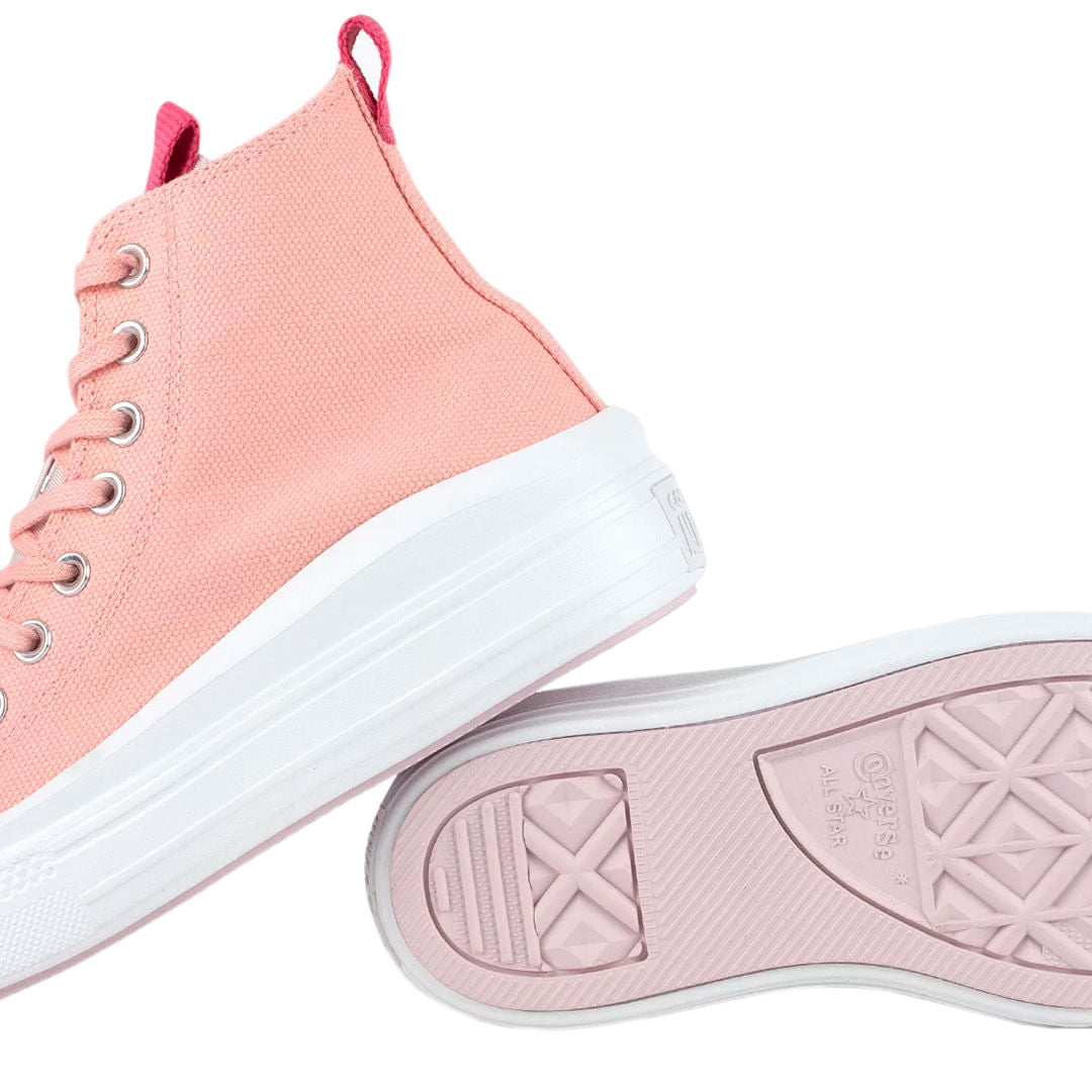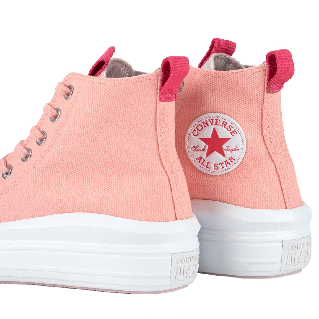 • O All Star Move cor de rosa é um tênis cano alto feito com lona de algodão rústica e lingueta de malha elástica, em contraste com o tom de rosa mais claro, as alças que auxiliam no momento de calçar e que ficam na parte traseira do tênis e na lingueta são em pink, com um tom mais vibrante. O solado do All Star Move é mais elevado, sendo aquele tênis plataforma que todo mundo ama!